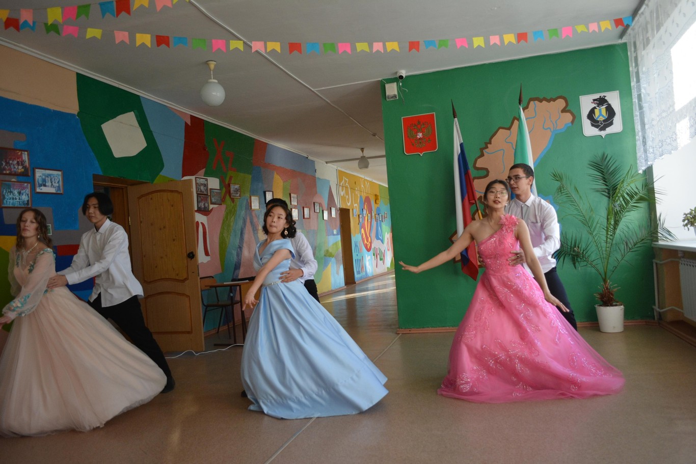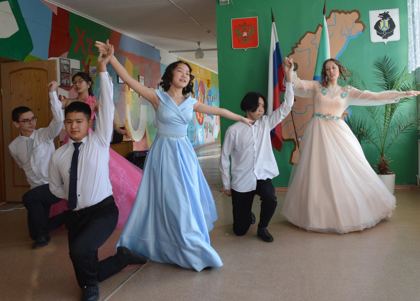 Для открытия Осенего бала старшеклассники (Брал Виктория, Романов Захар, Кавта Елизавета, Алиев Эльнур, Перевощикова Екатерина и Дечули Герман) станцевали красивейший вальс. Грацией, нежностью и элегантностью наполнены движения танцоров. Пары кружили по импровизированной сцене, завлекая зрителей красотой и легкостью.